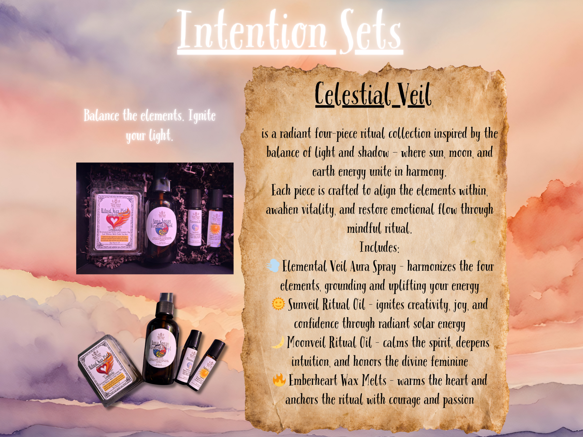The Celestial Veil Set is a radiant four-piece ritual collection inspired by the balance of light and shadow — where sun, moon, and earth energy unite in harmony.